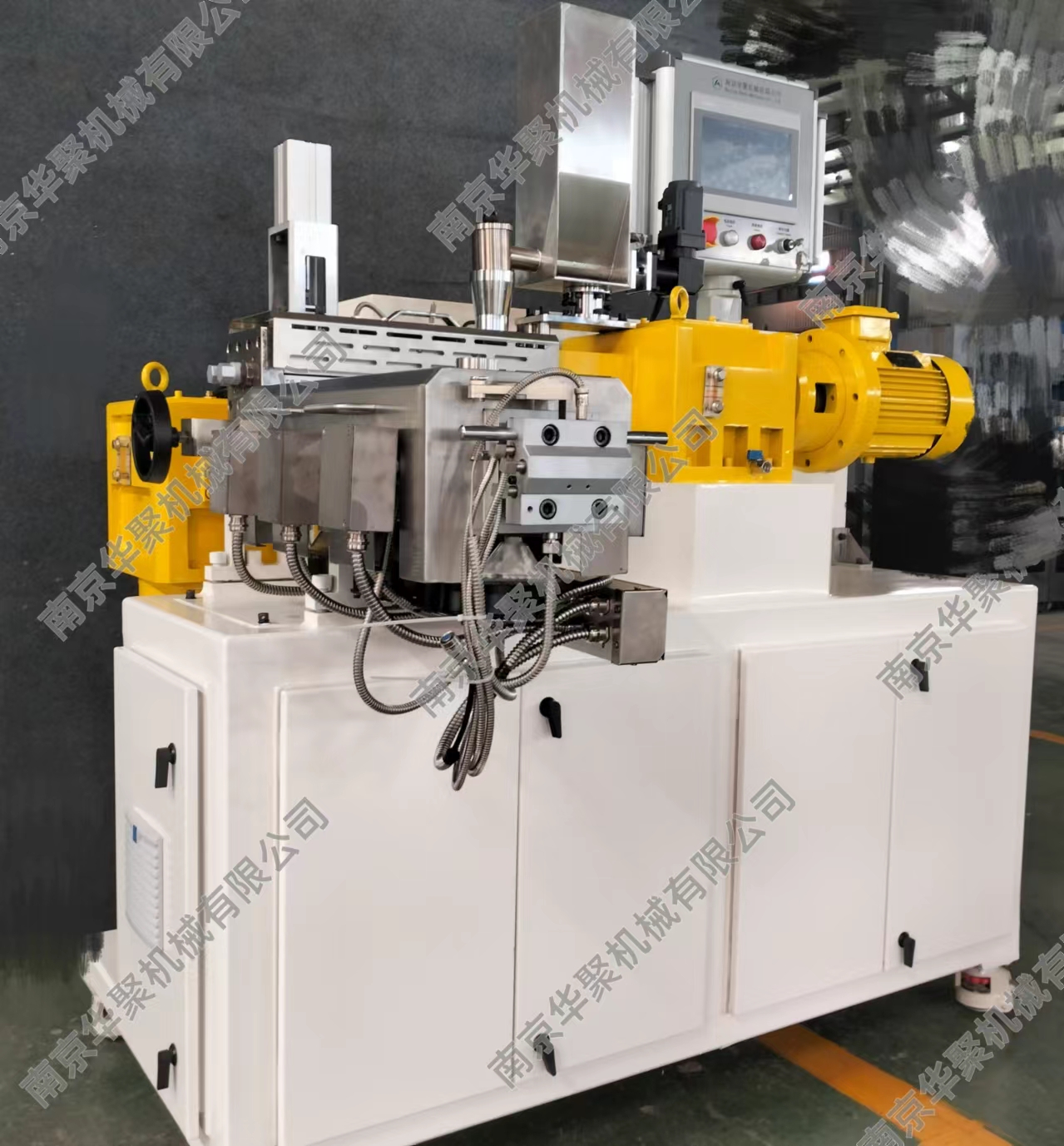 1、占地面積小,主機長寬高為1600X1350X1650mm,帶有移動腳輪。 2、集成連續(xù)密煉與雙螺桿的優(yōu)勢特點,連續(xù)式擠出,方便各種研發(fā)測試使用。 3、能耗低,裝機裝機功率22KW,實際操作功耗更低,類似一臺中央空調功率。 4、產量范圍1-10Kg/h,方便少量物料測試,伺服電機喂料驅動更穩(wěn)定精確。 5、一體化設計,電控冷卻系統全部集成,無需額外安裝,接電即用。 6、連續(xù)密煉機可翻轉腔體和雙螺桿快開機頭設計,方便清理及檢查維護。 7、全系統安全連鎖,觸摸屏操作,多處安全停機保護,使用更放心。 8、整機1噸,方便裝卸。